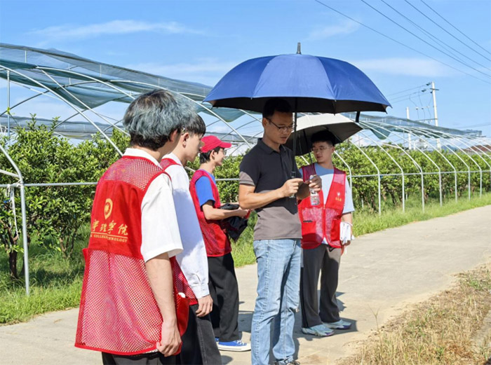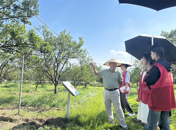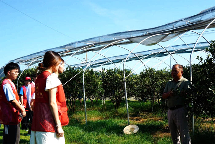 图为苗木基地技术人员向实践队员讲解金桔田间管理诀窍。罗彤书 供图