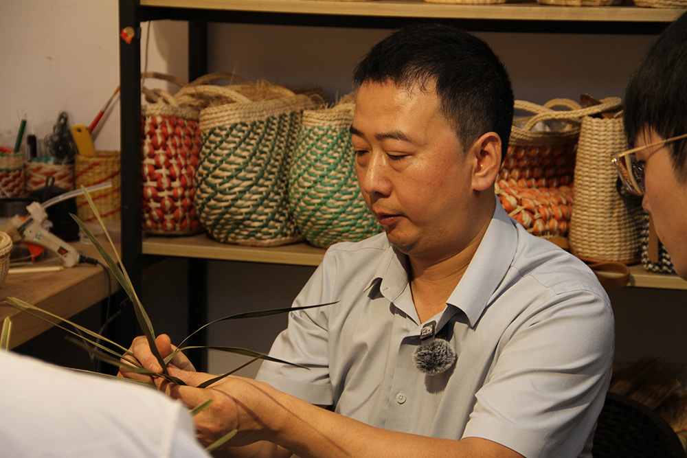 在采访交谈中,罗光林讲述了自己与草编结缘的故事和草编历史文化。从中调研团队了解到,传统的三峡草编就是用棕榈叶、玉米叶、艾草等植物编织物件,作于装饰和佩戴在身旁。“草编制品的价值不该只囿于一种经济实用链条,应具有较高的审美愉悦和鉴赏功能。”罗光林老师向团队道出了他对峡山草编的深刻思考和追求。为此,他将秭归本地的皮雕、刺绣等技艺融入草编创作,博采众长形成了独树一帜的“峡江草编”风格。