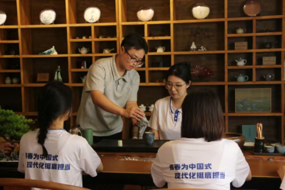 图为实践队员考察学习温杯、投茶、注水等泡茶步骤