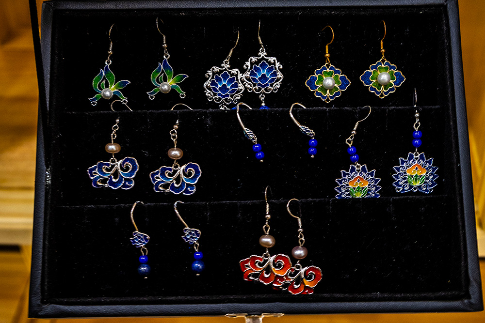 图为包钦将掐丝珐琅工艺与现代佩戴饰品结合,创作出耳坠。乐文俊通讯员摄