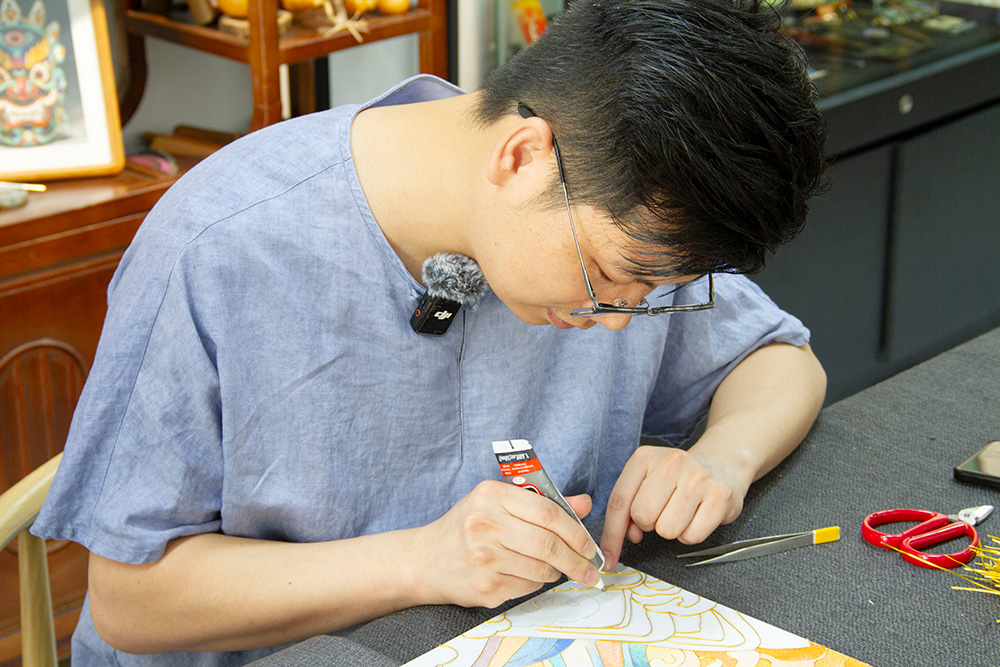 图为包钦老师沉静专注的进行掐丝珐琅中的掐丝过程。乐文俊通讯员摄