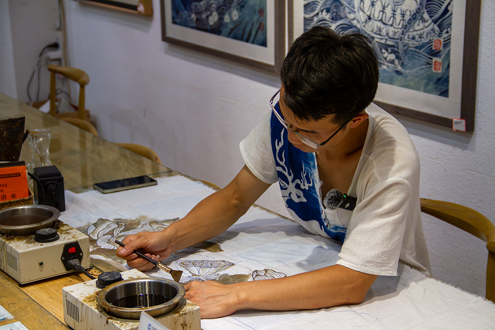 图为非遗传承人王曜老师的弟子刘东老师正在进行蜡染制作——上蜡。宋慧姿 通讯员摄
