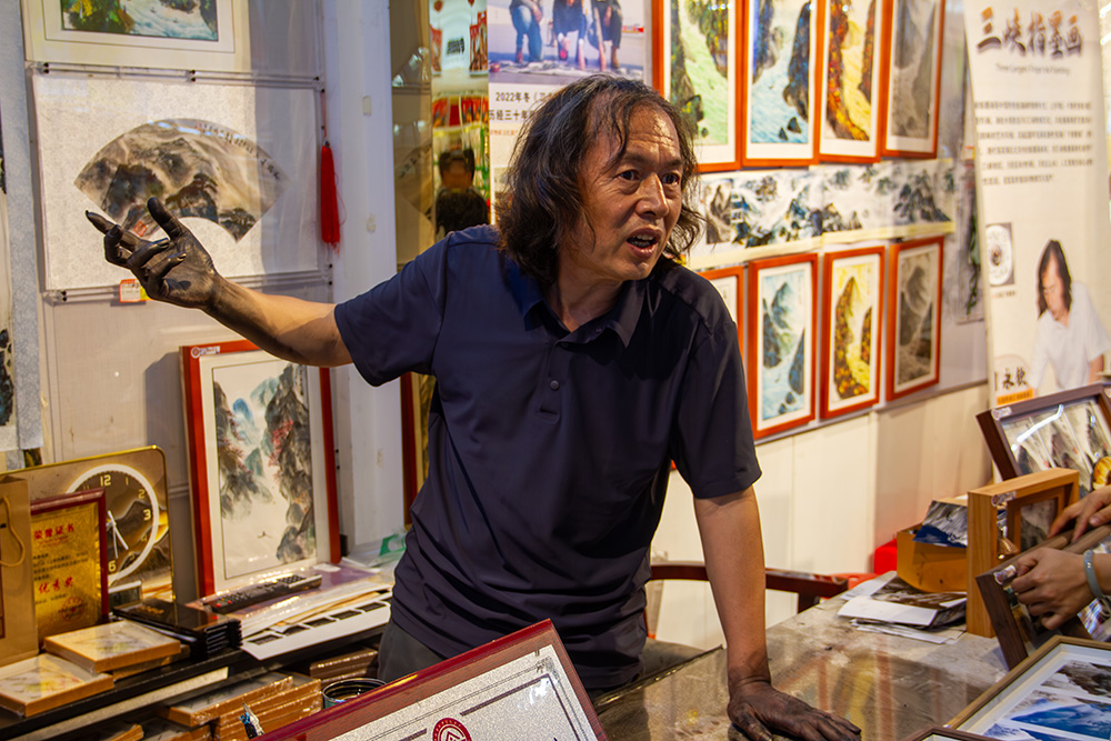 外师造化,中得心源。短短几分钟,西陵峡的自然风貌便跃然纸上。看似简单的过程,背后却是十几年如一日的苦练。习永钦老师7岁起随父亲习超铭学习指墨画,后又系统学习美术理论和表现技法,打下了扎实的美术基础。从厦门鼓浪屿的画廊到三峡大坝坛子岭景区,习老师凭借自己的摸索与感悟,专注于三峡风光的创作,成为三峡风光指墨画第一人,作品享誉中外。