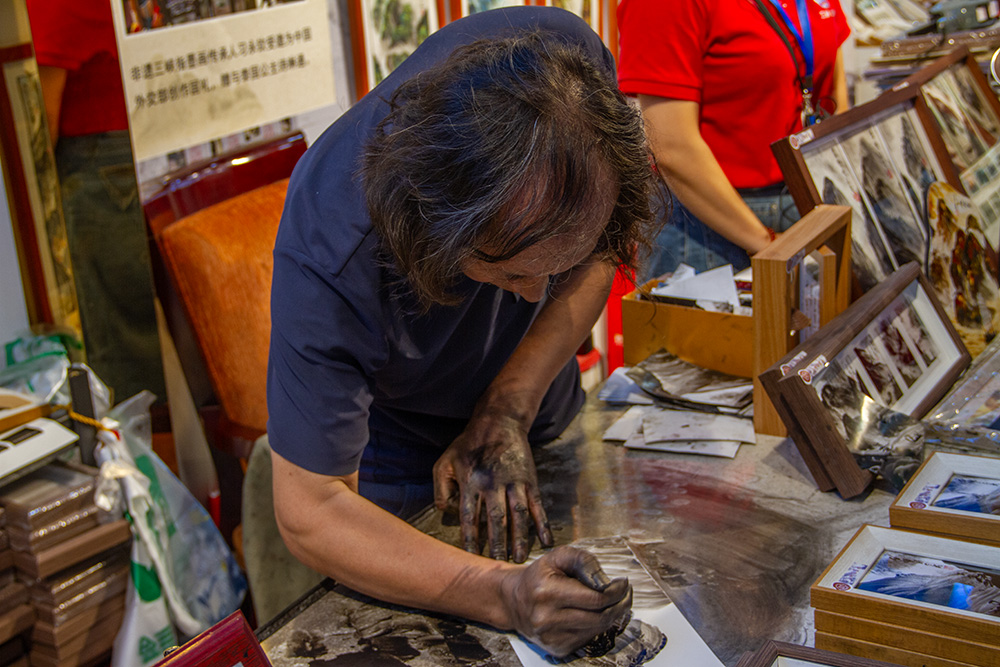 图为三峡指墨画第四代非遗传承人习永钦老师正在制作三峡指墨画。宋慧姿通讯员摄