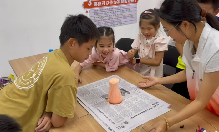 图为实践队队员模拟火山喷发实验。 沈俊廷摄