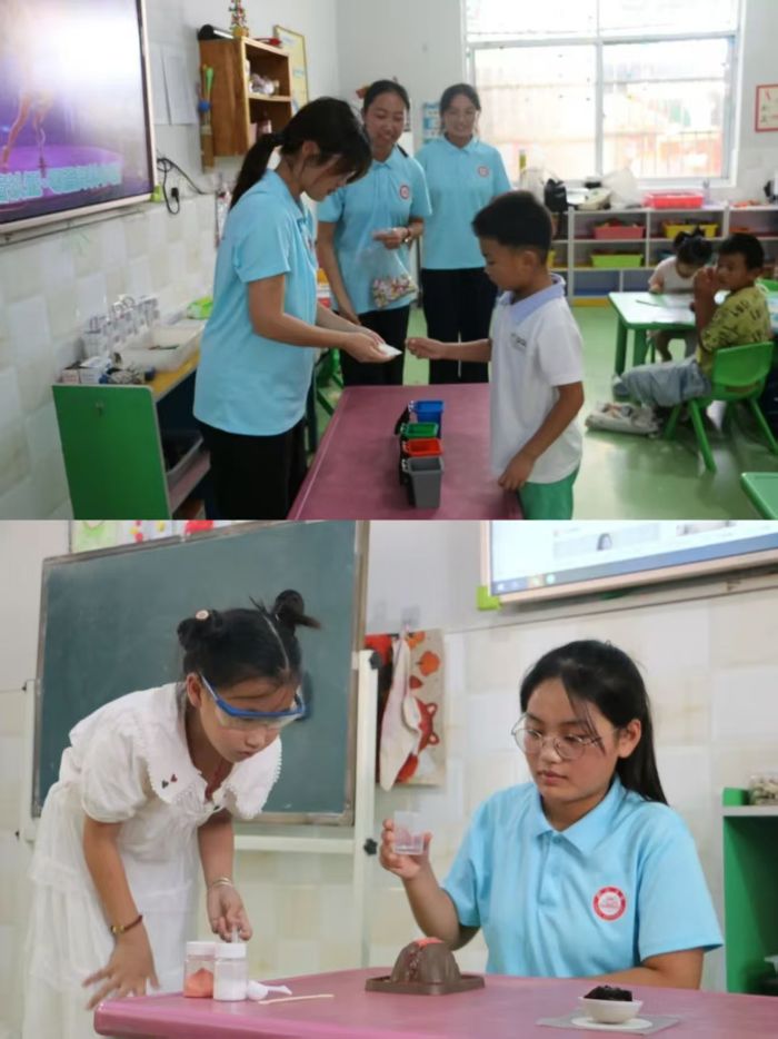 二组队员则走进当地爱心幼儿园,开展“化学趣味实验”科普活动。队员们用通俗易懂的语言和简易器材,为孩子们演示了奇妙的化学现象——彩色泡泡的形成、酸碱变色的魔术等,在轻松欢乐的氛围中激发孩子们对科学的好奇心,让科普种子在乡村幼儿心中萌芽。
