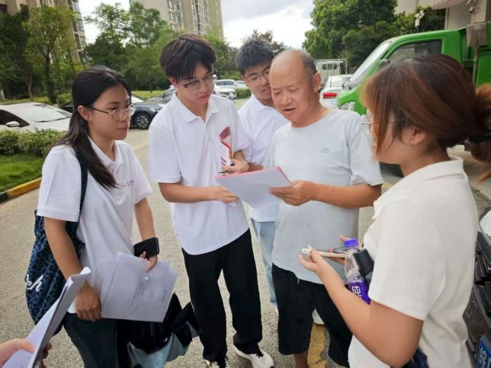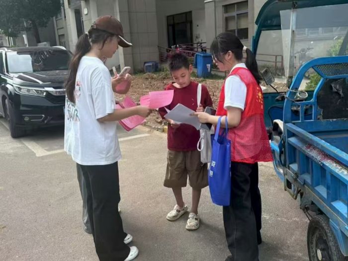 课堂上的互动教学让孩子们对防溺水知识有了直观认知,为了让安全知识像夏日的风一样吹遍社区每个角落,队员们迅速整理好教具,转身拿起一沓沓沉甸甸的防溺水宣传单页,走向了更广阔的“课堂”。7月22日下午三点,身着志愿服的队员们在社区广场、居民楼门口设点,结合传单发放同步开展问卷调研。实践团在社区开展活动时,撞见一位带着孩子的阿姨,立刻笑着凑上去“阿姨,耽误您两分钟,填下这份问卷好吗?主要想了解您家孩子平时去水边玩吗?”实践团成员们耐心引导居民填写,在面对老年居民则逐条念出问题,协助勾选答案。