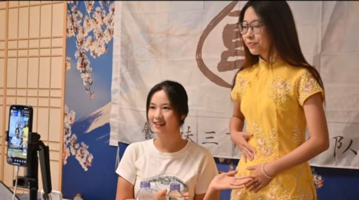 (图为实践团成员直播展示“学佬衫” 李智钰摄)