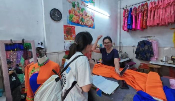 (图为“学佬衫”手艺人为队员介绍婚俗传统 李智钰摄)