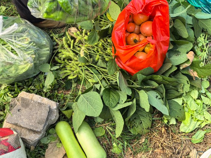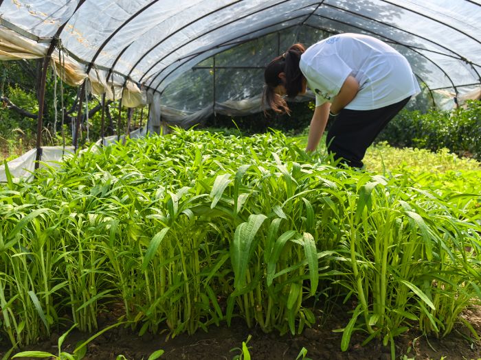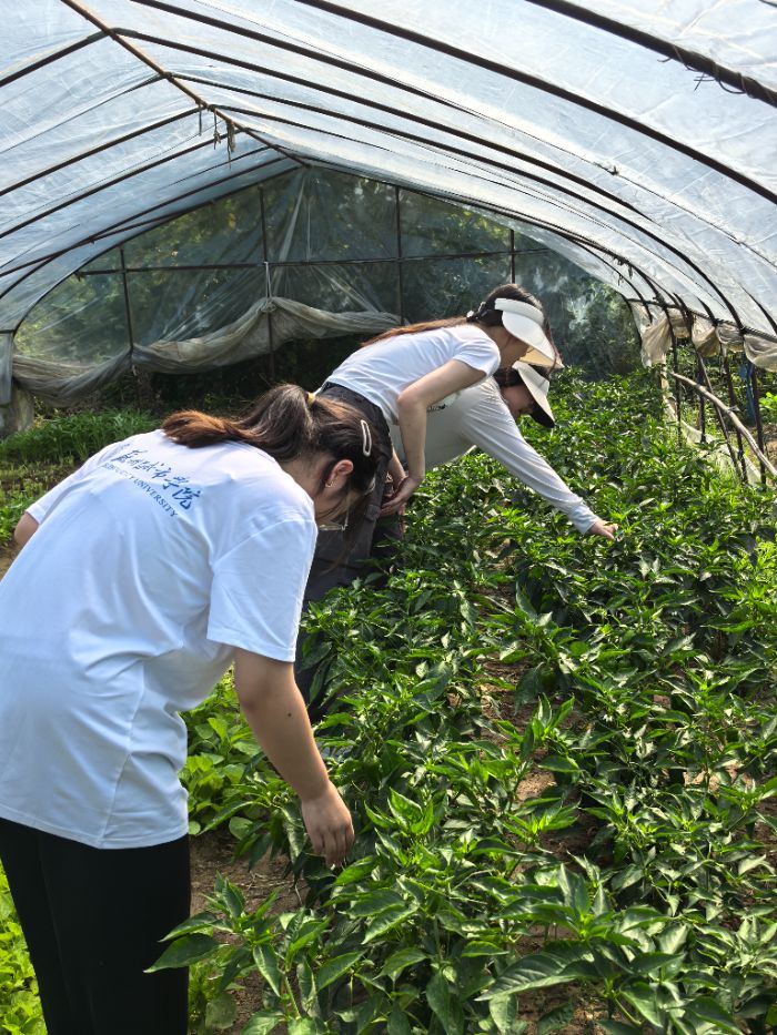 进入菜园的大棚区域,大棚内种植着小番茄和空心菜,成员们轻轻采摘,避免损伤枝叶。婆婆介绍,这些新鲜蔬菜采收后会直接送往当地饭店,形成稳定的“菜园—饭店”供给循环,既保障了农产品销路,又体现了助农理念的创新应用。团队成员通过试采部分果蔬,感受到现代农艺与传统智慧的结合,同时认识到加强农业基础设施的重要性,为未来优化种植模式提供了新视角。