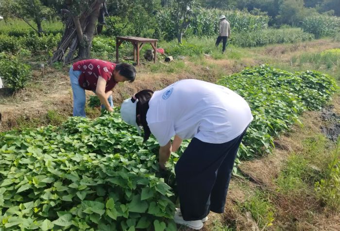 农耕启蒙:俯身垄间,汗水浇灌助农初心 小分队成员随西山当地一位婆婆前往菜地。途中,婆婆介绍,当地各村均有种植时令果蔬的传统,其中青种枇杷最为知名,几乎家家户户都有种植。菜地种植园已经有婆婆们在采摘蔬菜了,垂挂着的紫茄、嫩绿的地瓜藤,在婆婆们指导下,成员们迅速掌握其采摘技巧,同时了解到田地间多种果蔬的生长周期和日常管理技巧。这场与土地的对话,让团队成员对农耕生活有了直观认识,也为后续助农活动奠定了基础。