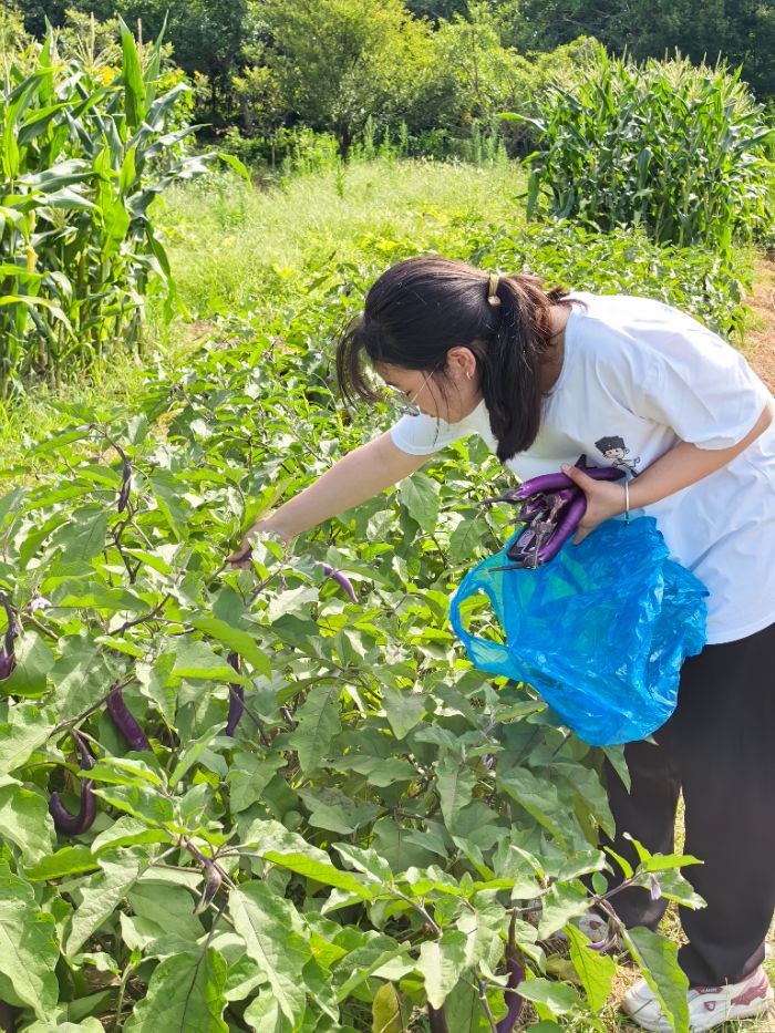 团队成员在地瓜苗区域学习挑选最嫩的芽尖,一袋袋嫩绿的地瓜藤在成员们的接力传递中,从田间直达分拣点。随后,成员们转至紫长茄种植区,小心护着枝叶来采摘品相良好的茄子。过程中,指尖的泥土与身上的汗水,是对“三农”最生动的教科书,每一株作物都凝结着村民的心血,短短数时,团队采摘的蔬菜可以供给一家饭店一天的需求量,成员们表示,连续帮助农民采摘一星期,就可以缓解一下农忙时劳动力短缺压力,提高其采摘效率。