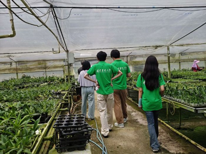 在王先生的引领下,实践队开启了参观之旅。触目所及,大棚中勃勃绿色生机。王先生细细介绍了家族在兰业方面种植心得及与台湾岛长期的贸易往来。目前兰花种植及经营主要采取专人定制业务,通过线上直播,致力于两岸的花卉文化交流。