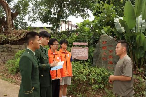 在承载边地记忆的“南疆上的高家庄”石碑旁,身着军装和志愿服的实践队员们,围站在巡边员身旁,认真聆听讲解。这场贴近边地烟火与戍边故事的交流,传递的不仅是边疆发展的过往,更是巡边护界的责任与坚守。让“青春护边关”的信念,在触摸土地、聆听故事中,锚定最质朴且坚定的方向。