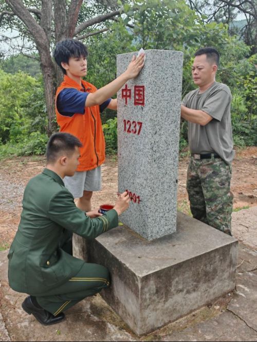 在山林环绕的边境之地,团队成员与巡边员携手开展界碑描红。身着军装、志愿服与迷彩服的身影,围绕“中国1237”界碑,以专注神情、郑重动作,赋予“中国红” 崭新光彩。这一抹鲜艳,不仅是对界碑的庄严维护,更是青春力量与戍边使命的交融,让“守护国土”的誓言,在界碑旁深深扎根、熠熠生辉。