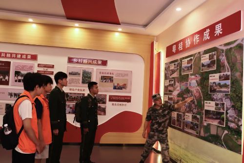在陈列着粤桂协作、乡村振兴成果的展厅内,巡边员潘武文为团队成员讲述那逢屯建设历史。实践队员仔细聆听,专注凝视画面与讲解者。这场跨越实践与历史的讲述,传递的不仅是发展历程,更是基层建设的坚守与协作,让 “探寻振兴路”的行动,在展板前成为触摸奋斗脉络的生动课堂。