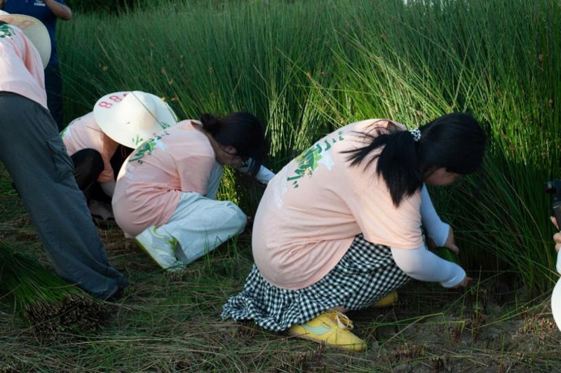 实践队在河埠乡团委书记王静安、塔溪村村书记吴俊荣、“产业村长”严爱根的带领下,实地考察当地特色灯心草产业的全产业链发展情况。据了解,该产业已为村民创造了大量就业岗位,目前相关产品深加工仍在持续创新当中。同时,实践队员们还深入田间地头体验收割灯心草,通过江西省林业科学院博士贾全全、灯心草手工艺品编织手艺人邓丽红的生动课堂感受科技赋能和手工非遗的魅力,让实践队员们对灯心草产业助力乡村振兴有更深入的理解。