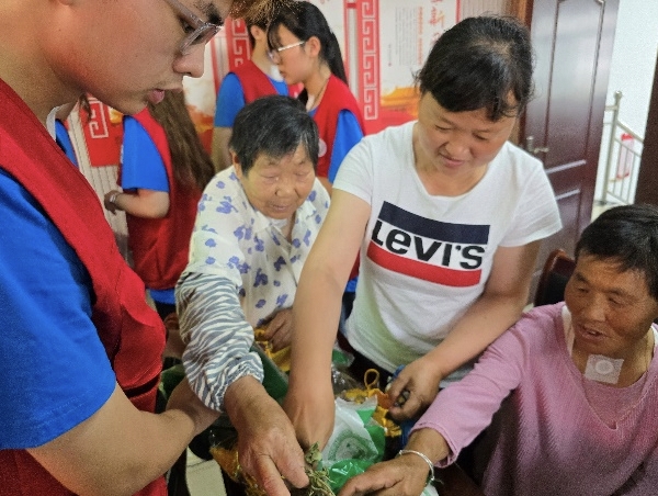 图为“华园药院青年”实践团队带领村民包香囊。王慧娟 供图