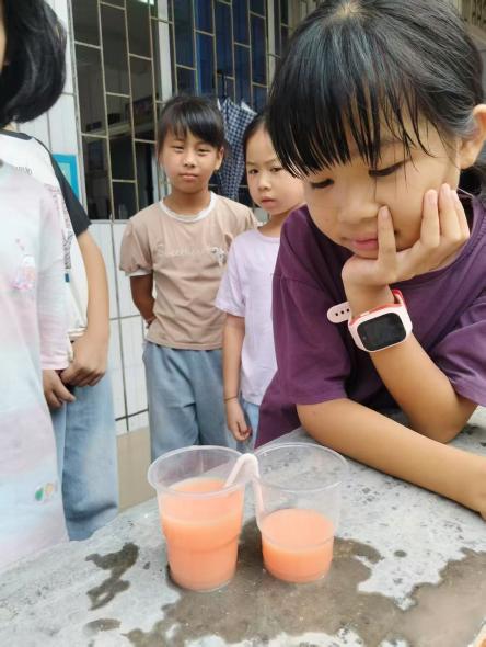 在科学课堂,实践团成员通过趣味实验,如“虹吸效应”“密度分层”等,将深奥的科学原理转化为生动有趣的现象,带领孩子们探索奇妙的科学世界,激发他们对未知的好奇心与探索欲;讲解物理科学知识时,成员吴洁盈用杯子和吸管制作简易装置,给孩子们演示“虹吸效应”,底下的学生纷纷站起来观察杯中水位的变化。即使是下课了,充满好奇的孩子们也会围着她,迫不及待的亲手尝试实验,感受科学的神奇。