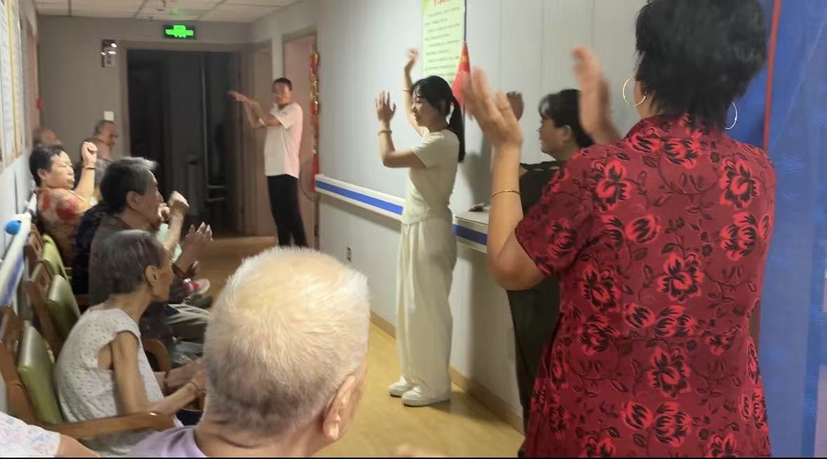 (实践团成员和爷爷奶奶一同挥舞手臂运动)
