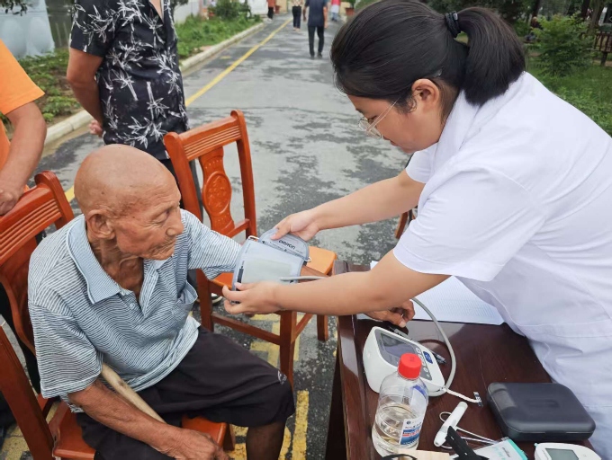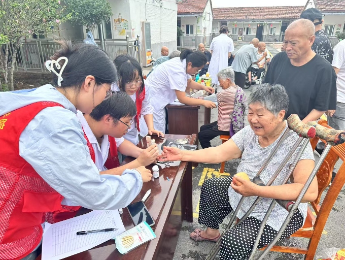为关注老年人健康,奉献爱心,于8月7日,安徽中医药大学“岐黄薪火”实践团队赴临泉县金色时光老年公寓进行爱心义诊活动。在养老院的义诊现场,由工作人员和实践队队长带领,青年志愿者们细心周到、有条不紊地为居民们进行了血压测量、血糖测量、按摩、发放水果等工作。真情融入义诊,温暖群众胸怀。(通讯员 朱艳楠)