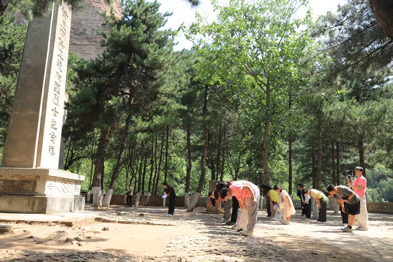 在黄崖洞纪念碑前,实践团成员列队肃立。当洁白的花朵轻放于烈士纪念塔下,材料工程专业学生宋学文在实践笔记中写道:“先辈们用‘土锉刀’淬炼大国利器的意志,藏着最动人的工匠密码 —— 甄荣典那双变形的手,在没有精密仪器的年代,把每道锉痕都打磨得丝毫不差。”