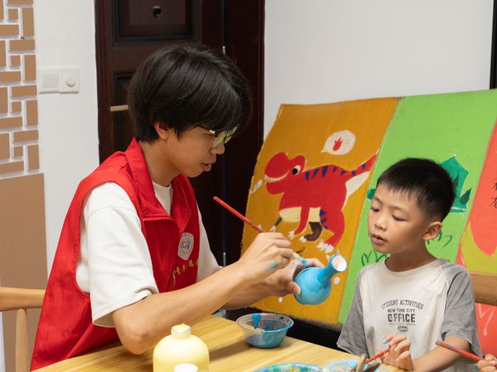 志愿者们悉心讲解基础的绘画技法和创作要领后,便将舞台完全交给这群小小艺术家。只见他们屏息凝神,小手紧握画笔,将心中烂漫的奇思妙想,尽情倾泻于陶罐之上,原本朴拙的陶罐仿佛被注入了生命,绽放出鲜活灵动、斑斓生辉的艺术之花。