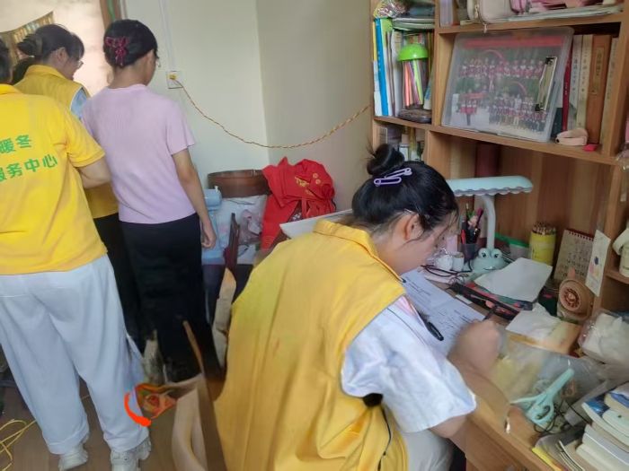 图为志愿者填写爱心小屋使用情况刘海荧摄