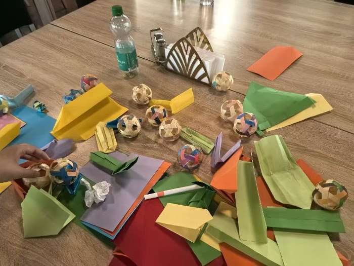 教室内,参与者们围成圈坐在桌前,彩纸在手中折叠翻飞,实践团以“非遗龙泉宝剑”为主题的折纸活动正在进行,队员们首先向参与者介绍:这把纸剑的原型,是有着2600多年历史的龙泉宝剑,它不仅是古代军事技艺的结晶,更象征着诚信高洁,体现了中华民族的尚武精神与工匠精神。为让参与者们更好动手实践,团队将复杂剑形简化为易操作的折纸版本。成员在步骤讲解过程中以当地风景作比“剑要折得挺直,才能像阿尔卑斯山一样‘巍峨持久’。”这一隐喻其实也与中瑞两国在历史长河中坚守自身特色、抵御外界挑战的精神相呼应;折纸过程中,团队成员分散在各桌,耐心示范,用英语指导大家用红白两色纸张折叠,红色是对“中国红”的呼应,白色能更好模拟剑身的寒光。活动现场气氛热烈,其乐融融。