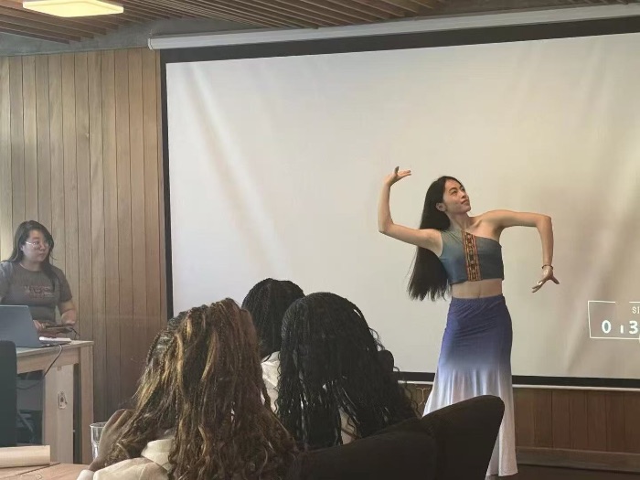 歌舞之韵:身体律动里的心灵共鸣 手工时间结束后,《月光下的凤尾竹》旋律悠扬,傣族舞教学环节紧凑展开,实践团成员身着傣族服饰首先进行了舞蹈的表演,接着将简化的动作一一示范,参与者们都兴致勃勃地模仿舞蹈姿势,尽管动作略显生疏,但每个人都积极参与、切身体验。最后,实践团成员发挥作为外院学子的优势,发起中英法三语版的《友谊地久天长》合唱活动。中文、英文、法文三国语言此时同唱响在一间教室,旋律传递着欣欣向荣的和谐。“语言虽有界,歌声却无界。”团队成员们特意选择这首在中瑞两国都广为人知的曲目,用多语言演绎的方式,不仅呼应了瑞士多语文化的包容特质,也特别展现了中国青年对跨文化沟通的诚意。