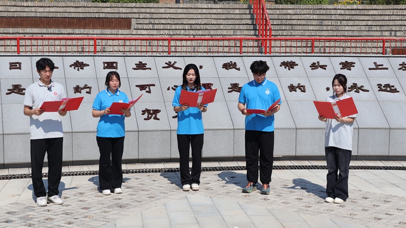 随后,实践团成员王心怡和张鑫阳站到众人面前,重温誓词:“今天国难当头,为了共同对付日本帝国主义,我愿带头穿上灰衣服,戴上白帽徽。别看我们外表是白的,可心里是红的,永远是红的!” 这掷地有声的誓言,穿越时空,仿佛将大家带回了那个热血沸腾的年代,让每一位成员都感受到了先辈们坚定的信念与无畏的勇气。紧接着,实践团成员诵读了《论持久战》的节选。字里行间,蕴含着深刻的战略智慧与必胜信念,大家沉浸其中,对那段历史有了更深刻的理解,也更真切地体会到抗战精神的丰富内涵,它不仅仅是一种抗争,更是一种坚韧不拔、百折不挠的民族精神。
