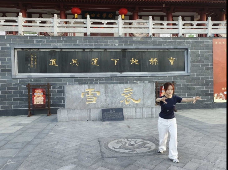 实践团队创新采用"学习-实践-传播"三位一体模式,在曹操运兵道这一三国文化遗址中开展非遗展示。地下迷宫般的运兵道前,丰飒爽通过模拟仙鹤展翅的舒展姿态,让参与者在历史场景中感受传统养生功法的独特魅力,千年非遗与现代生活在此刻产生奇妙共鸣。
