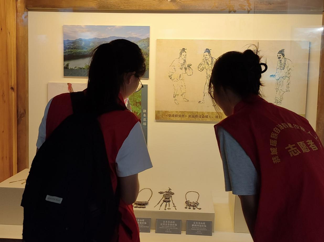 实践团第二站走访位于瑶族盘王阁内的恭城瑶族博物馆和西岭村民族文化陈列馆,参观瑶族非遗文化。一方面,通过生动的影像资料,团队成员直观地了解到瑶族刺绣、建筑等非遗技艺的传承过程。另一方面,通过访谈博物馆讲解员和民族文化陈列馆讲解员及当地村民,学习了解恭城瑶族的非遗文化,同时团队成员结合旅游管理的相关知识与学院特色,更深入了解与体会了恭城非遗的历史、文化和艺术价值,为积极探索文旅融合,助力恭城非遗文化传播奠定了坚实基础。