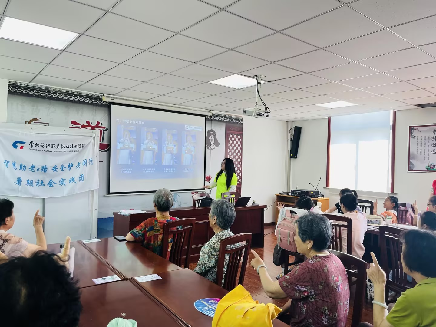图为志愿者爱眼护眼知识宣讲 此次活动不仅得到了老年人的广泛好评,也产生了深远的社会影响。通过实践团的努力,老年人的应急救护知识、法制意识、爱眼护眼知识等均得到了显著提升。同时,活动形成的老年人再就业状况调研报告,为相关部门制定政策提供了宝贵的数据支持和意见参考,有助于推动老龄事业的健康发展。更重要的是,此次活动唤起了社会各界对老年人问题的广泛关注和理解,促进了代际之间的和谐交流。它让我们看到,关爱老年人不仅是对传统美德的传承,更是构建和谐社会、实现老有所养、老有所乐的重要一环。未来,我们期待更多的社会力量能够加入到关爱老年人的行列中来,共同为老年人的幸福晚年贡献力量。未来,我们期待构建政府引导、企业参与、社会组织协同的多元共治格局,通过完善老年友好型就业环境、开发适老化岗位、建立跨代际互助机制等系统性举措,共同推进老龄事业高质量发展,使"老有所养"向"老有所为"实现价值跃升,真正构建可持续的老龄服务体系。
