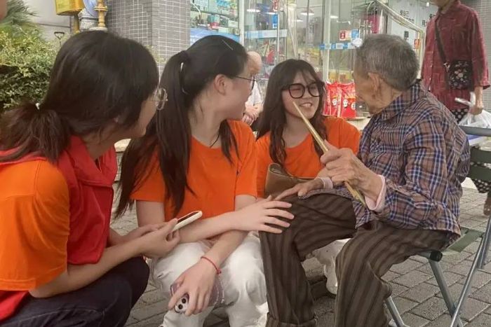 最动人的片段,发生在一位90岁老人的身边。学子们围坐倾听,老人颤巍巍地说起自己作为新中国首批养老金领取者的故事:“以前哪敢想,老了还能月月领到钱,这日子是党给的甜啊!”说到动情处,他拉起学子的手,领大家唱起《东方红》。苍老的嗓音混着青春的合唱,在小区里久久回荡,仿佛一场跨越时代的对话,让红色记忆在歌声里代代相传。