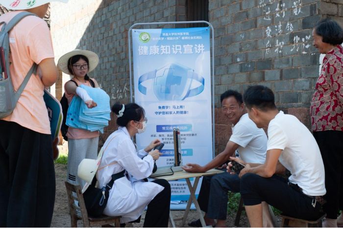 还记得我们与村医一起去乡亲们家里义诊时,实践队员们亲切地为乡亲们挽起袖子量血压,一边量血压一边询问近况、开展调研,我们和村医一起为乡亲们进行健康宣讲,针对个人情况提出健康建议。义诊结束后,乡亲们总是会拿出西瓜招待我们,笑脸盈盈地说吃完再走。我们走访了很多相亲家,他们的热情总让我们倍加感动。这样的感动充斥在这七天里,从田间地头的亲切指引到惠民活动的互动交谈,无一不让人动容。