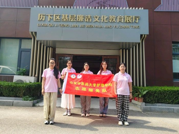 图为山东中医药大学护理学院志愿服务队在历下区基层廉洁文化教育展厅前合影