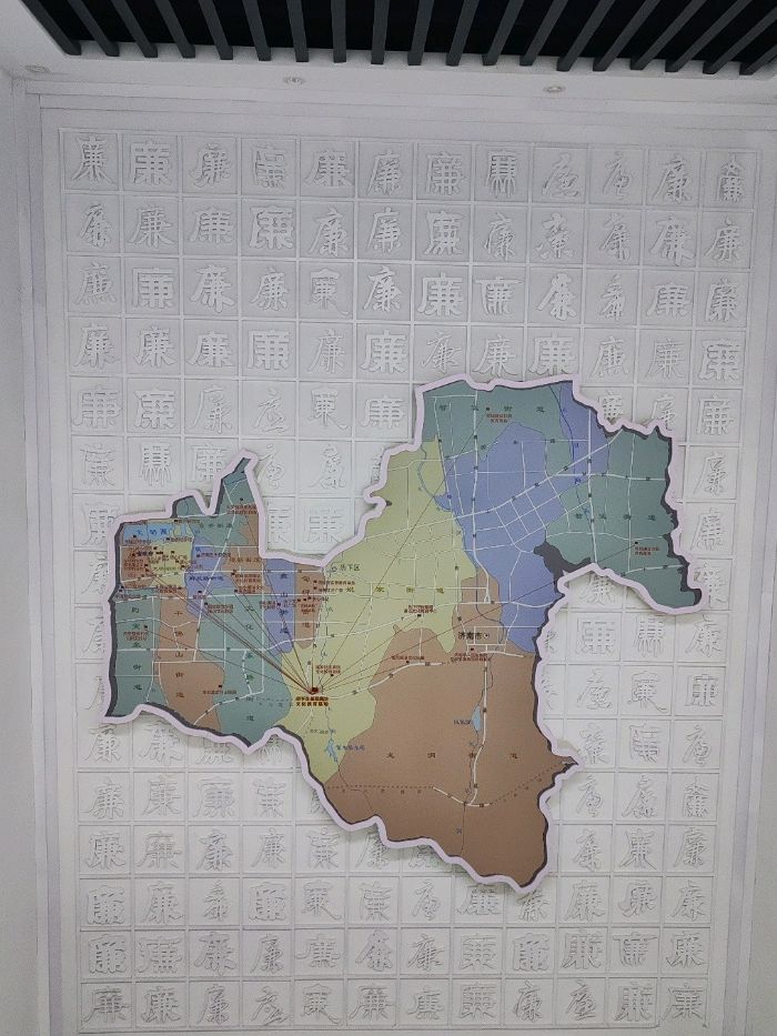 图为展厅内廉洁文化墙,满墙“廉”字与区域地图彰显廉洁文化的地域深耕