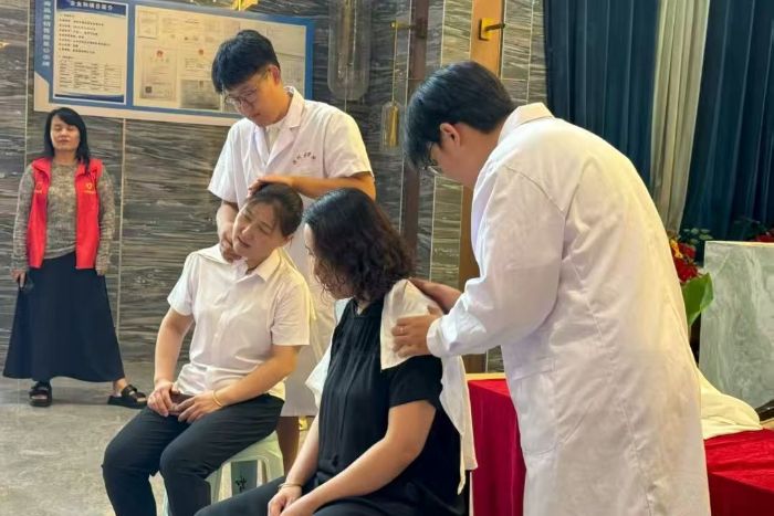 在梁中·苹果郡社区,王醊恩教授带领研究生团队提供专业指导,给社区居民提供专业中医诊疗服务。针对关节炎、失眠、暑湿困乏等常见病症,队员们分组协作:艾灸温热驱散老年群体关节寒痛,推拿巧劲化解上班族肩颈僵直,耳穴压豆技术调和居民气血循环,血压测量并提供健康饮食建议。