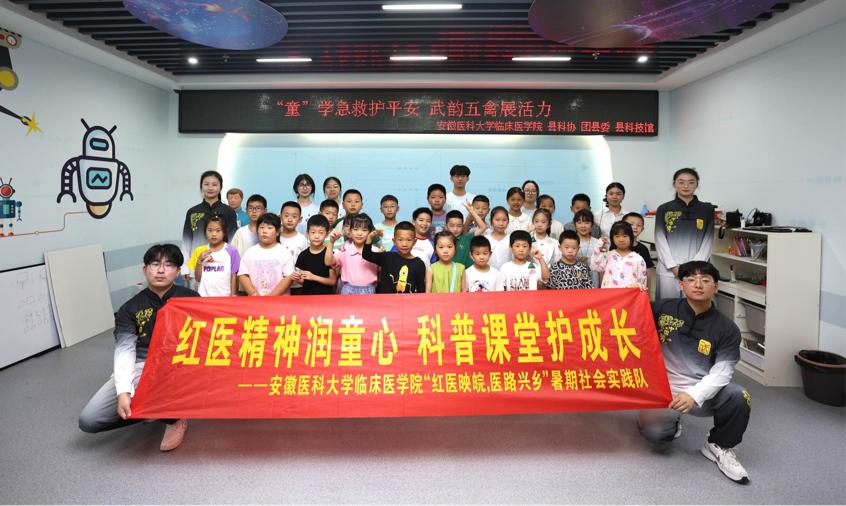 为响应时代号召,安徽医科大学临床医学院“红医映皖,医路兴乡”实践团队,在6月28日至29日走进六安市霍山县科技馆,以“医学科普+文化传承”双轮驱动,为乡村和社区儿童打造“急救防护课堂”“人体科学实验室”“非遗武术工坊”三大沉浸式体验场景,让科学与传统在情景体验中绽放光芒。