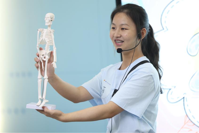 在人体科学展区,一副可拆解骨骼模型成为“明星教具”。团队成员王晓菲轻轻转动模型的肩关节,向孩子们演示:“就像积木搭城堡,我们的206块骨头互相连接,才能跑能跳。”活动现场,通过骨骼模型展示,队员们深入浅出地介绍骨骼支撑的原理,还组织孩子们在实践中认识人体骨架结构。团队以寓教于乐的方式,带领孩子们探索人体微观世界,激发他们对生命科学的兴趣,为科学启蒙播下种子。