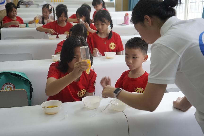 实践队走进光泽县第一中学圣农新城附属学校及市民活动中心,为当地暑托班的200多名小学生精心设计并带来了一场场妙趣横生的化学科普盛宴。实践队在指导老师的专业指导下,针对小学生的年龄特点,开发了一系列浅显易懂却又蕴含丰富知识的化学科普实验,巧妙地将课本知识转化为指尖可触、视觉可观、味觉可感的生动体验——晶莹剔透、一触即爆的果汁爆珠,遇水显形的神奇“无字天书”,以及光影交织、喷涌而出的“火山灯”,瞬间点燃了孩子们对科学的好奇心与探索欲。