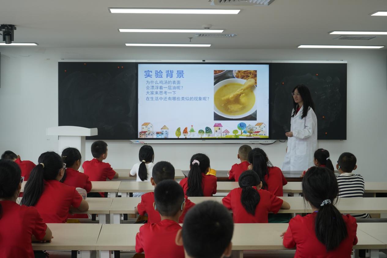 科普活动为了启迪孩子们的智慧,在实验中设计了许多思考的环节,在“无字天书”的实验中通过一个贴近生活的问题——“为什么鸡汤上面有一层油?”巧妙地引出了水油不相容的原理。用孩子们能理解的比喻解释“火山灯”实验:“水分子爱‘抱团’,油分子爱‘独处’,所以它们‘分家’啦!”孩子们在体验中培养兴趣,在探索中提出疑问,在思考中启迪智慧,在精彩纷呈的化学实验中初窥世界的奥妙。