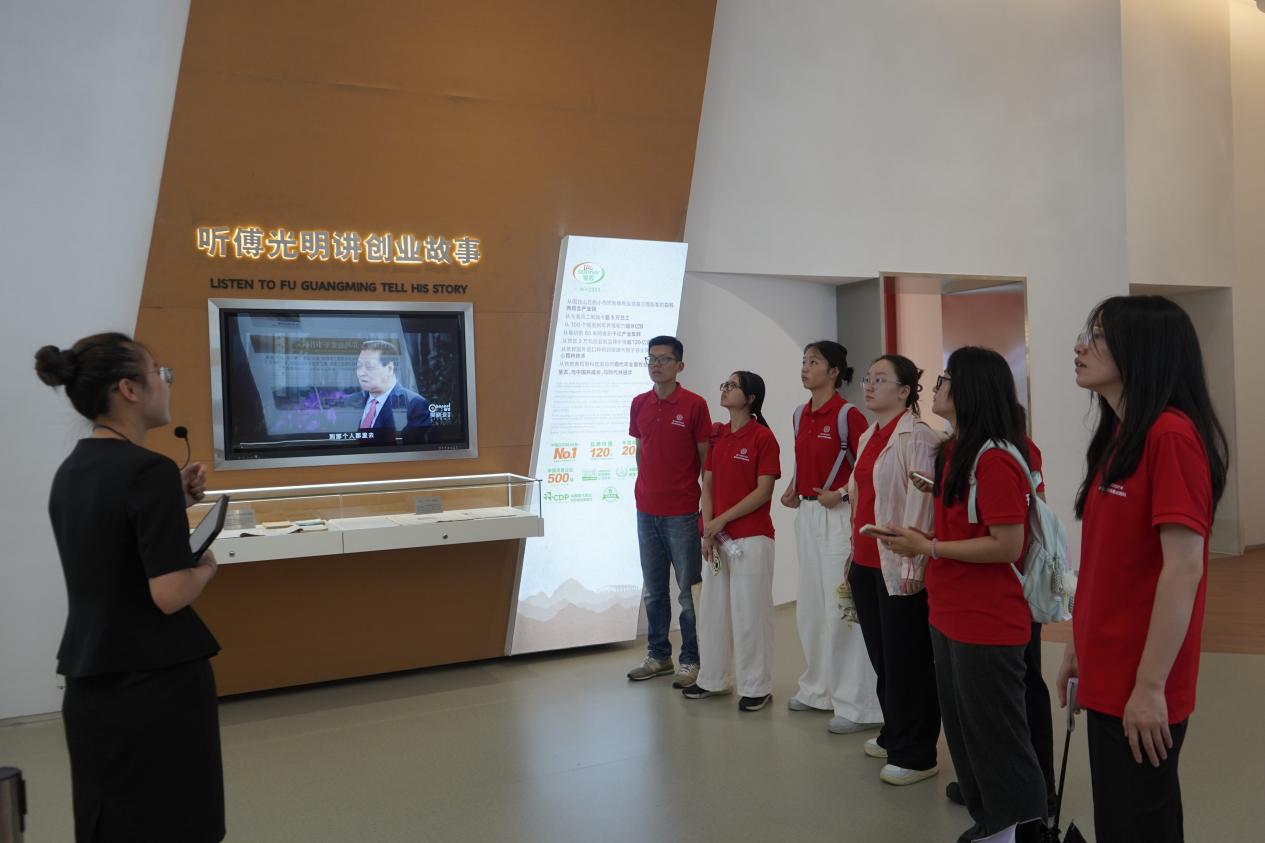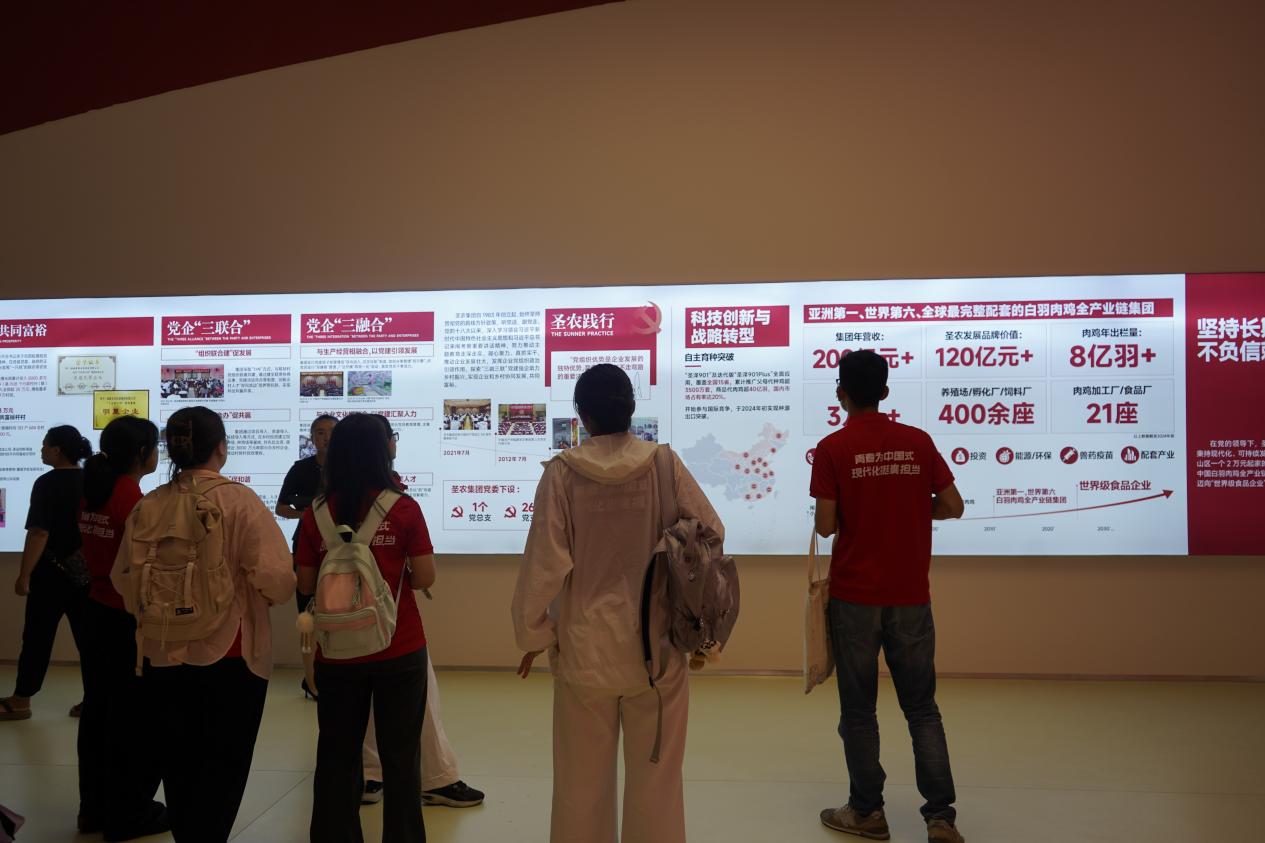 实践队一行走进了圣农集团。从宣传视频和展馆介绍中,了解到圣农集团从1983年2万元创办养鸡场起步,经过40余年的艰苦奋斗,如今已发展成为年营收超200亿元、员工数超3万人、从养殖到加工的全产业链布局的农业产业化龙头企业。为了解决白羽肉鸡国产化,圣农集团花费10余年、耗资10亿元培育“圣泽901”,成功摆脱鸡蛋依靠进口的局面。圣农集团还延伸了“绿色循环经济产业链”,将鸡粪、谷壳等废物转化为有机肥和生物质能源,在保护环境的同时实现了资源的高效利用。这种“资源—产品—废弃物—再生资源”的闭环模式,不仅带动了周边3万多人就业,促进了县域经济的全面发展,更为乡村振兴提供了宝贵的借鉴经验。