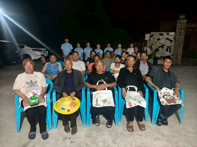 夜幕降临,安山村的广场上热闹非凡。实践队组织的线下普通话教学活动准时开始,成员们首先带领村民们复习了白天线上教学的内容,通过领读、跟读、互动问答等方式,帮助村民们巩固所学的普通话知识。随后,精彩的游戏活动环节正式拉开帷幕。跳大绳、唱红歌、猜字谜、击鼓传花、打羽毛球、跳广场舞等一系列丰富多彩的游戏互动,让村民们在轻松愉快的氛围中进一步感受普通话的魅力。实践队还为到场参与活动的村民们准备了草帽、帆布包、文具、故事书等精美奖品,这极大地激发了村民们的参与热情,现场气氛热烈,欢声笑语不断。