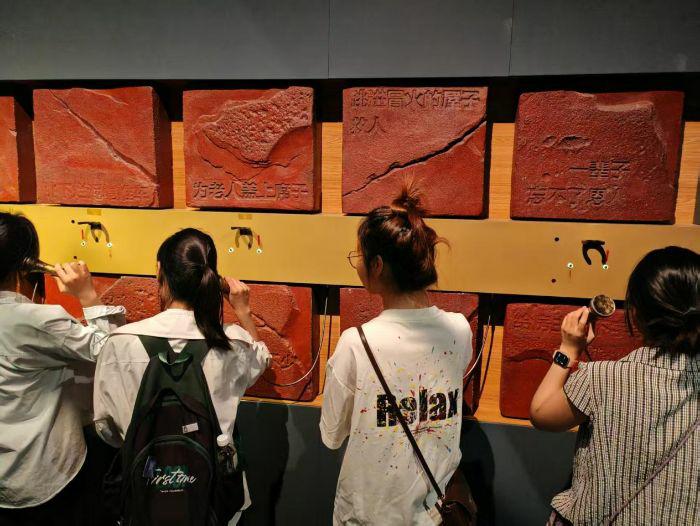 实践团队进入“六十六个瞬间”展区,墙上摆放着66块特制砖瓦,每一块砖瓦有着一段淮海战役中的故事:有战斗时,战士喊着“死了都要守住这个阵地”;有“快为老人盖上席子”的场景;还有“他牺牲了,还是保持着最坚挺的姿势”的英雄事迹……这些砖瓦像是历史的“记忆载体”,以独特的陈列方式吸引参观者探寻背后的历史。