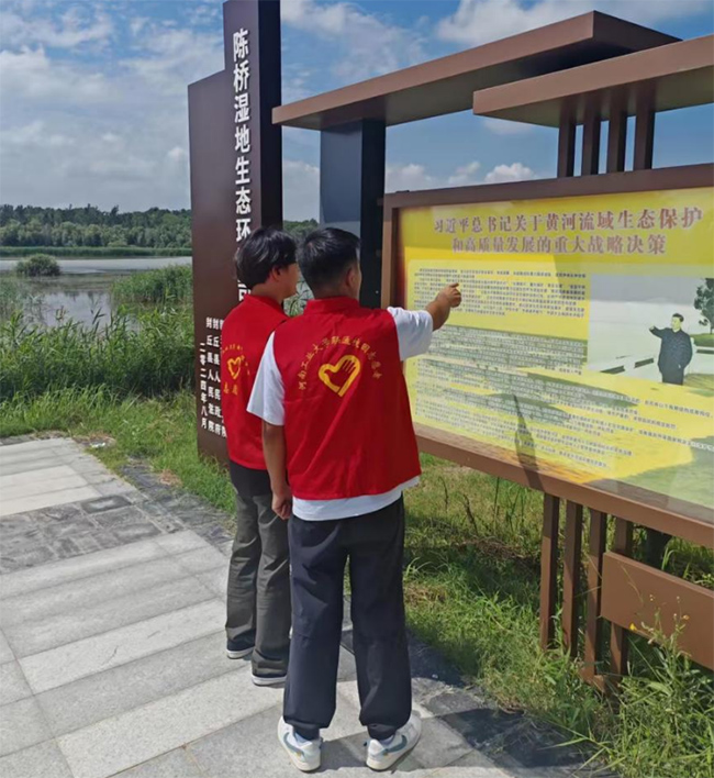 02陈桥驿湿地公园:研湿知护,青春悟担当 随后,小队走进陈桥驿湿地公园。这里作为黄河流域生态节点,水草丰茂、飞鸟栖息,也是生态保护实践的“课堂”。队员们沿湿地栈道,记录动植物与生态修复成果,学习法治与科学护湿经验并向小朋友们宣传。“湿地是‘地球之肾’,保护它需要科学与行动。”队员们交流道,深刻领会生态保护的“硬核”与“柔性”力量。