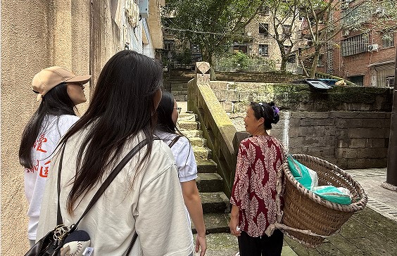 在理论学习的基础上,团队成员来到巴南区二圣镇与当地村民围坐畅谈。面对调研对象多为老年人,存在听力下降与方言隔阂的双重挑战,团队邀请当地同学担任“翻译官”,并用生动语言搭配肢体手势耐心解释,让询问变得温暖顺畅。巴南区率先形成的落户农民农村权益自愿有偿退出“1+3+1”政策体系,使得昔日零散的土地在社会资本的助力下新生,有效激活了乡村产业活力。一位队员感慨道:“退出后的土地用来发展民宿、乡村旅游,又让这里焕发出了别样的生机。”