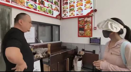 图为团队成员在向饭馆主厨了解菜品中山茶油添加情况