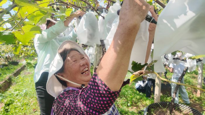 接着,实践队走进小寨村葡萄种植基地实地展开调研。该基地为露天种植,品种以夏黑葡萄为主,因地处山区、地块分散,从疏果、拉穗到采摘全程依赖人工,农忙时村民常从清晨劳作至傍晚。在调研中队员发现,基地通过土地流转实现规模化经营,每亩向村民支付1000元租金,既盘活了土地资源,又为村民带来稳定收入。